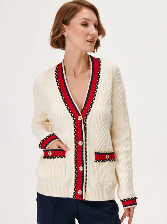 Cream and Red Cable Knit Cardigan - JOINUS
