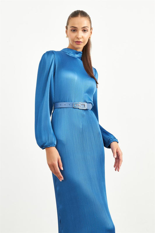 Blue Pleated Embellished Dress - Escoll