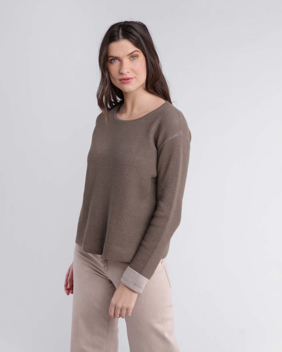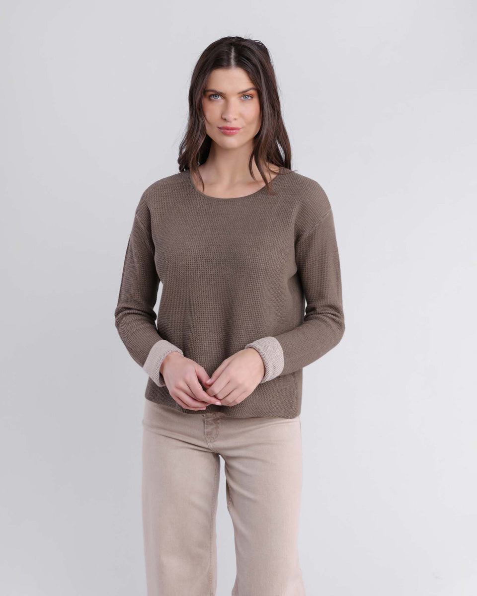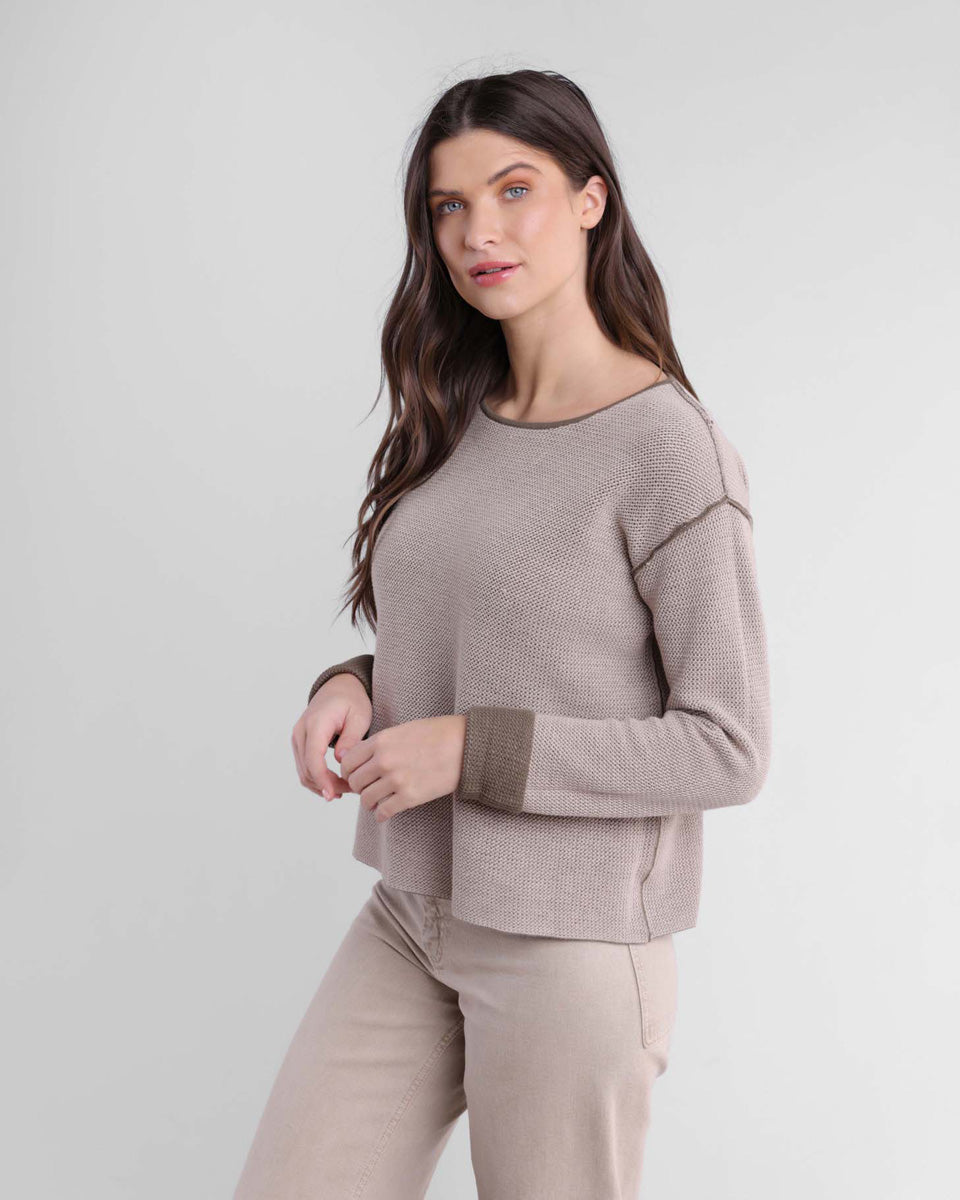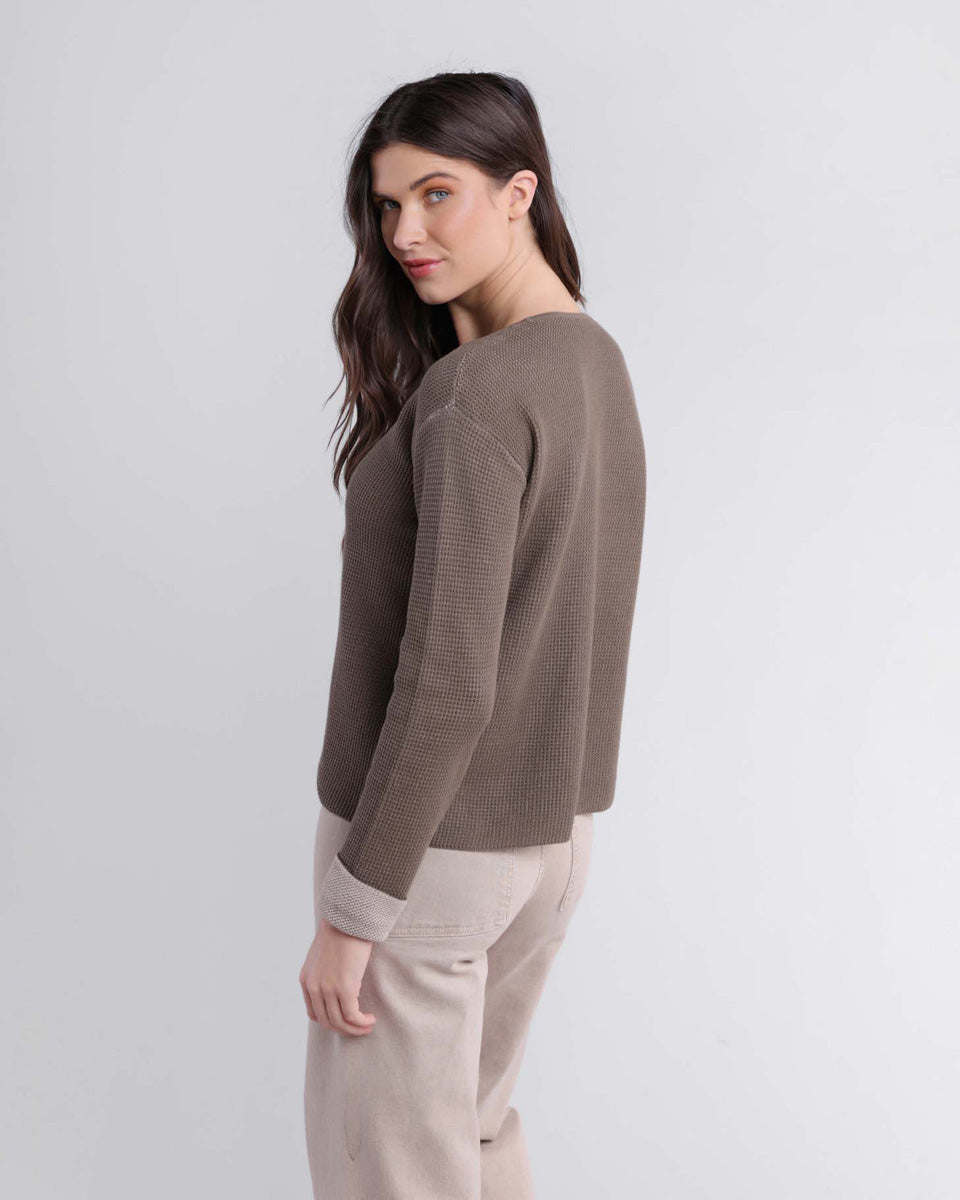 The Plaited Reversible Pullover is a unique cashmere sweater. Made in a soft, mesh stitch Cotton Cashmere blend this style is comfortable and chic. Fully reversible with beautiful colors on each side make this style versatile. Cuff the sleeve to show the color on the inside for even more character.