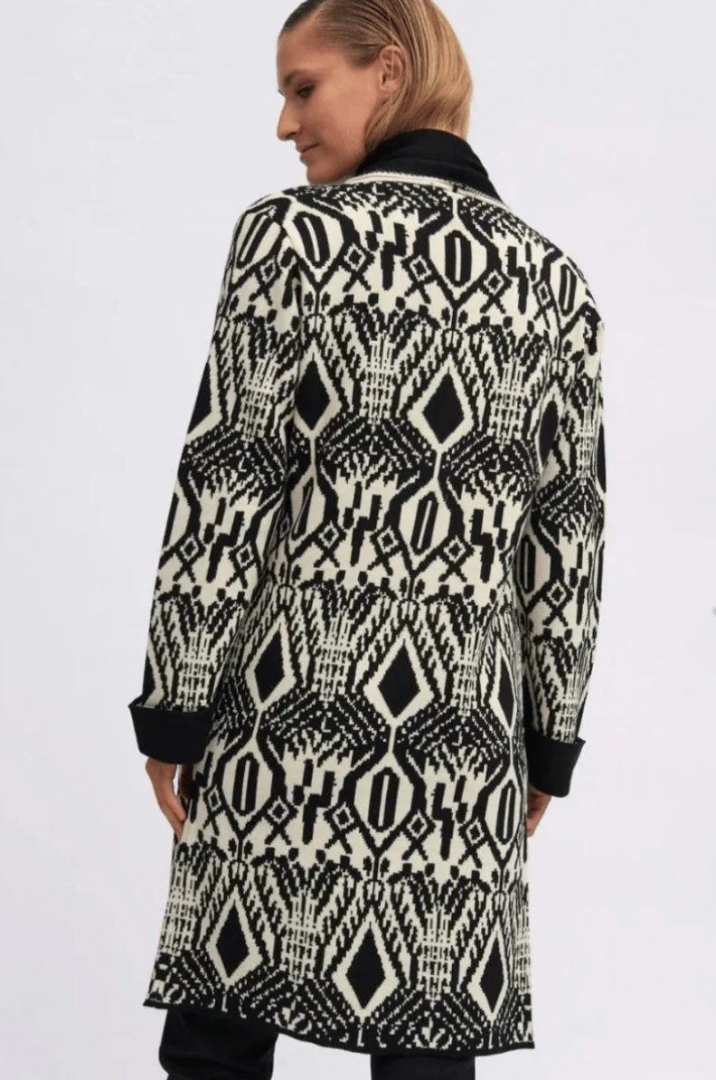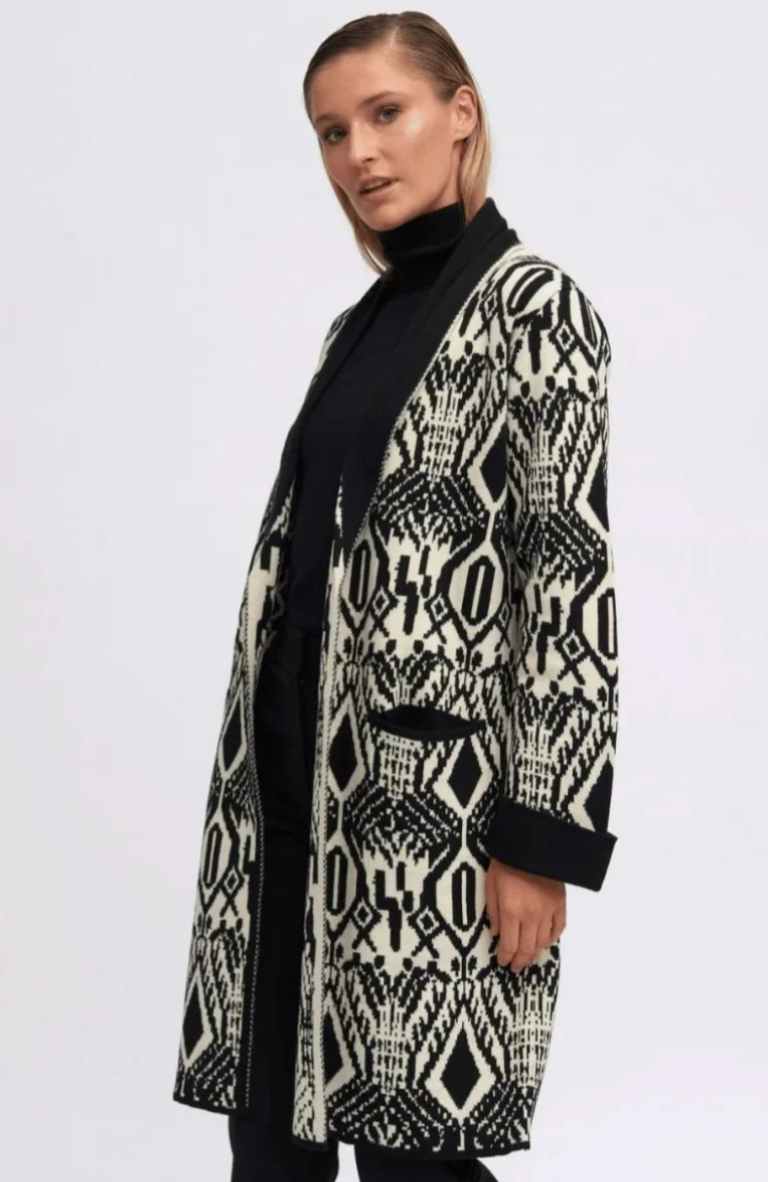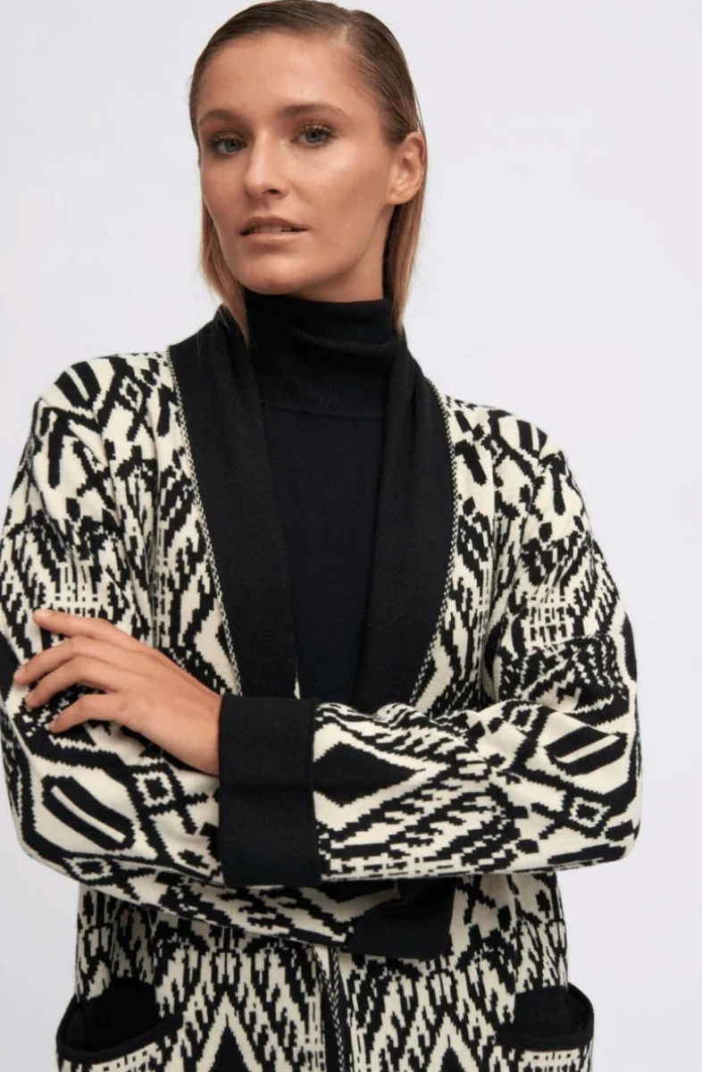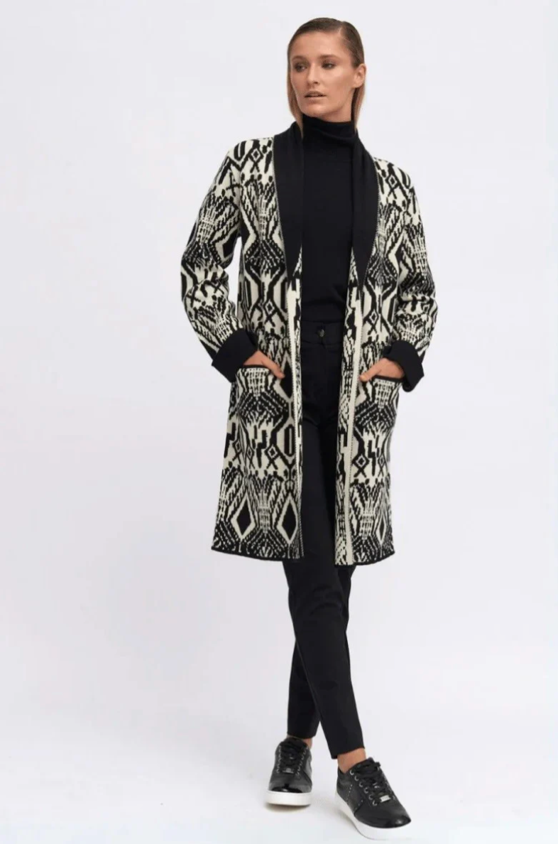 This Leria 3/4 Knitted Cardi offers a stylish layering option with its long, knitted design featuring a geometric, ethnic pattern in black and ivory. This straight pull-on cardigan is designed with front pockets at the hip and a knitted tuxedo lapel. Cut to the knee, it boasts a low straight silhouette that can be styled year-round for effortlessly chic looks. Layer it over a simple tee and jeans for a casual daytime outfit, or dress it up with a blouse and trousers for a more polished ensemble.