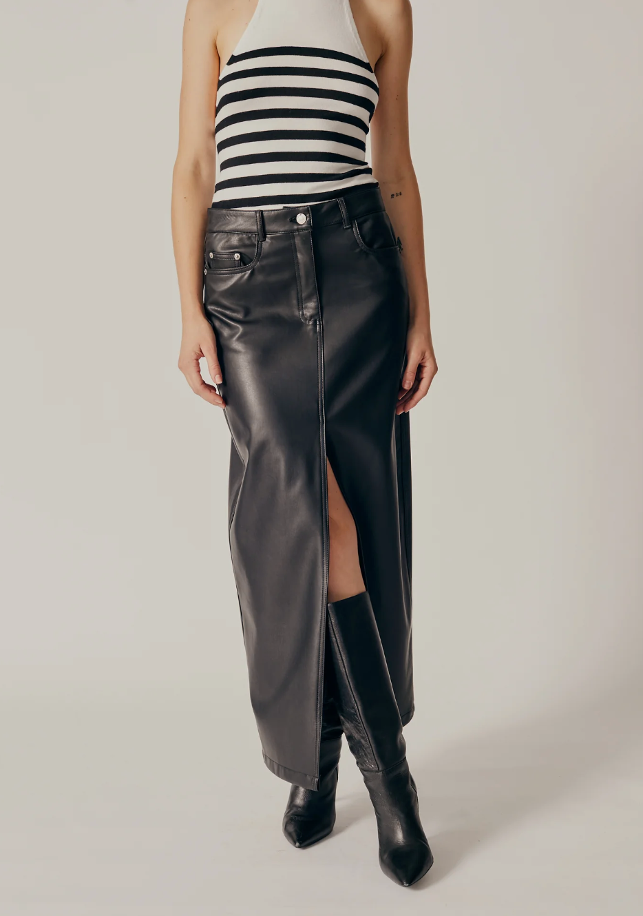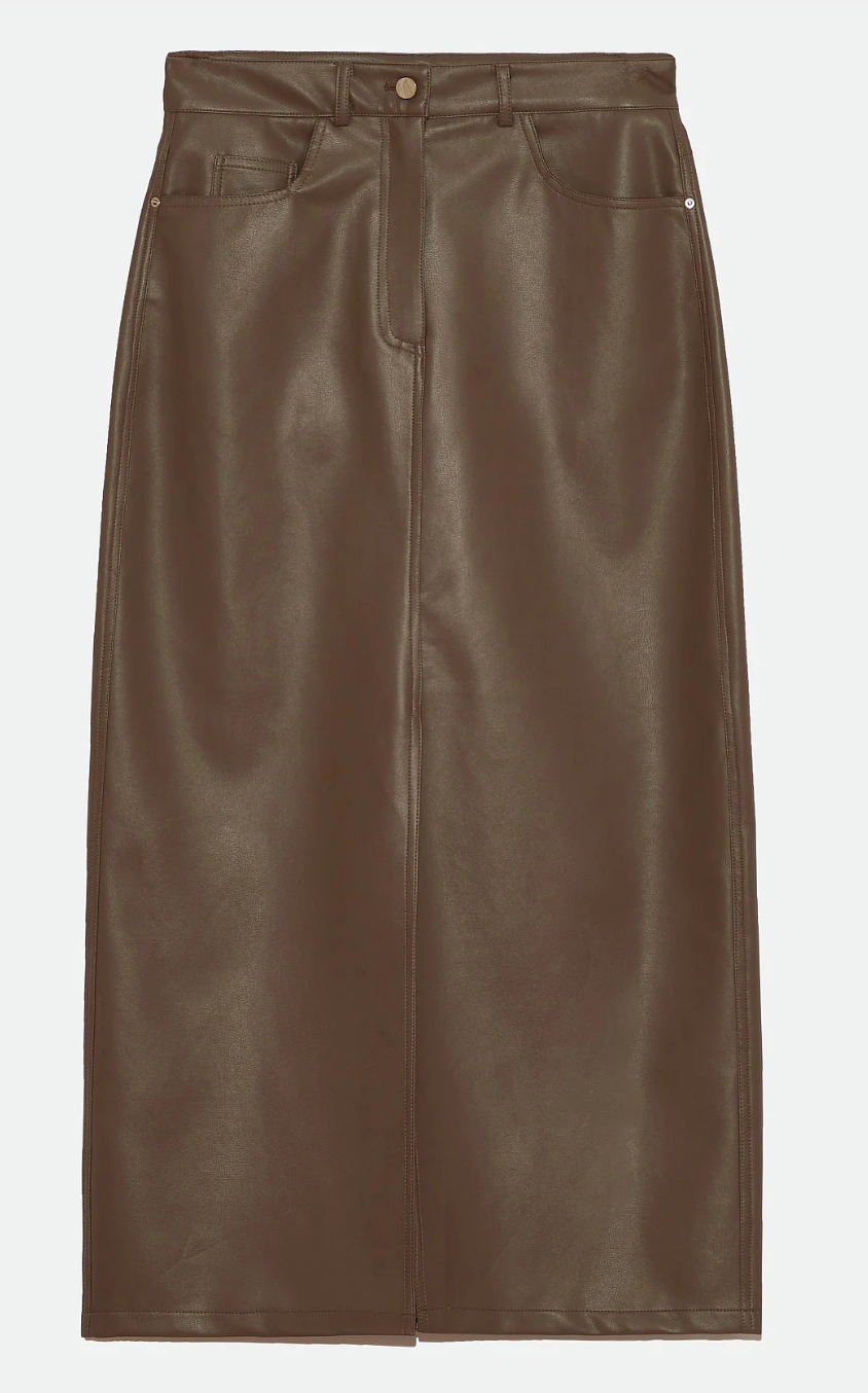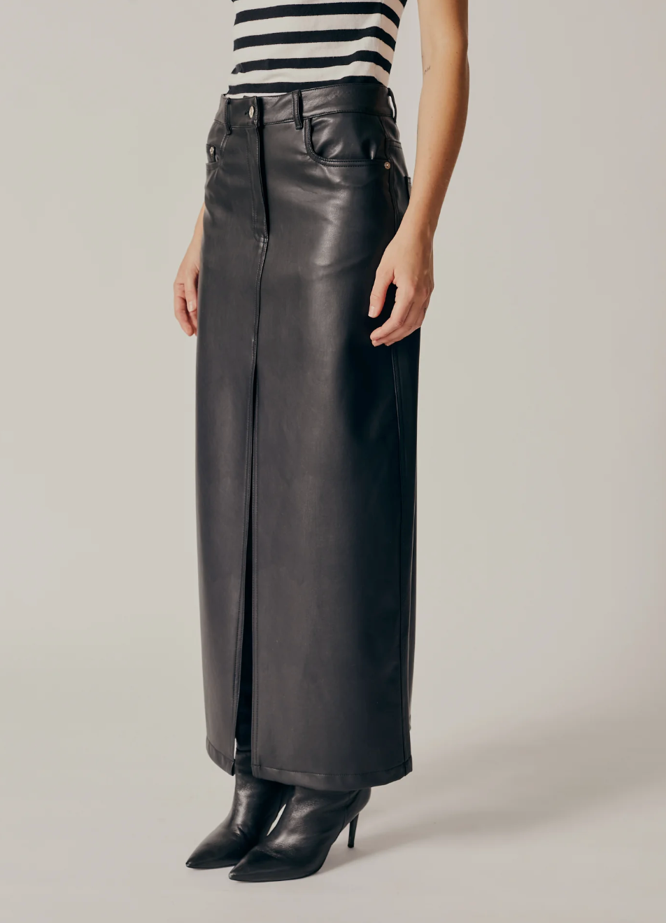 Vegan leather pencil maxi skirt. Front pockets and back patch pockets. Big slit on center front. Front button and zip for closure.