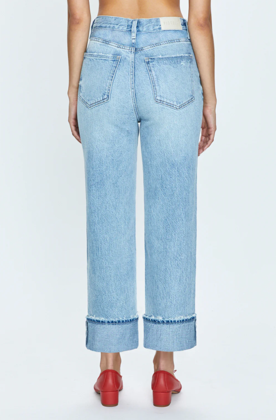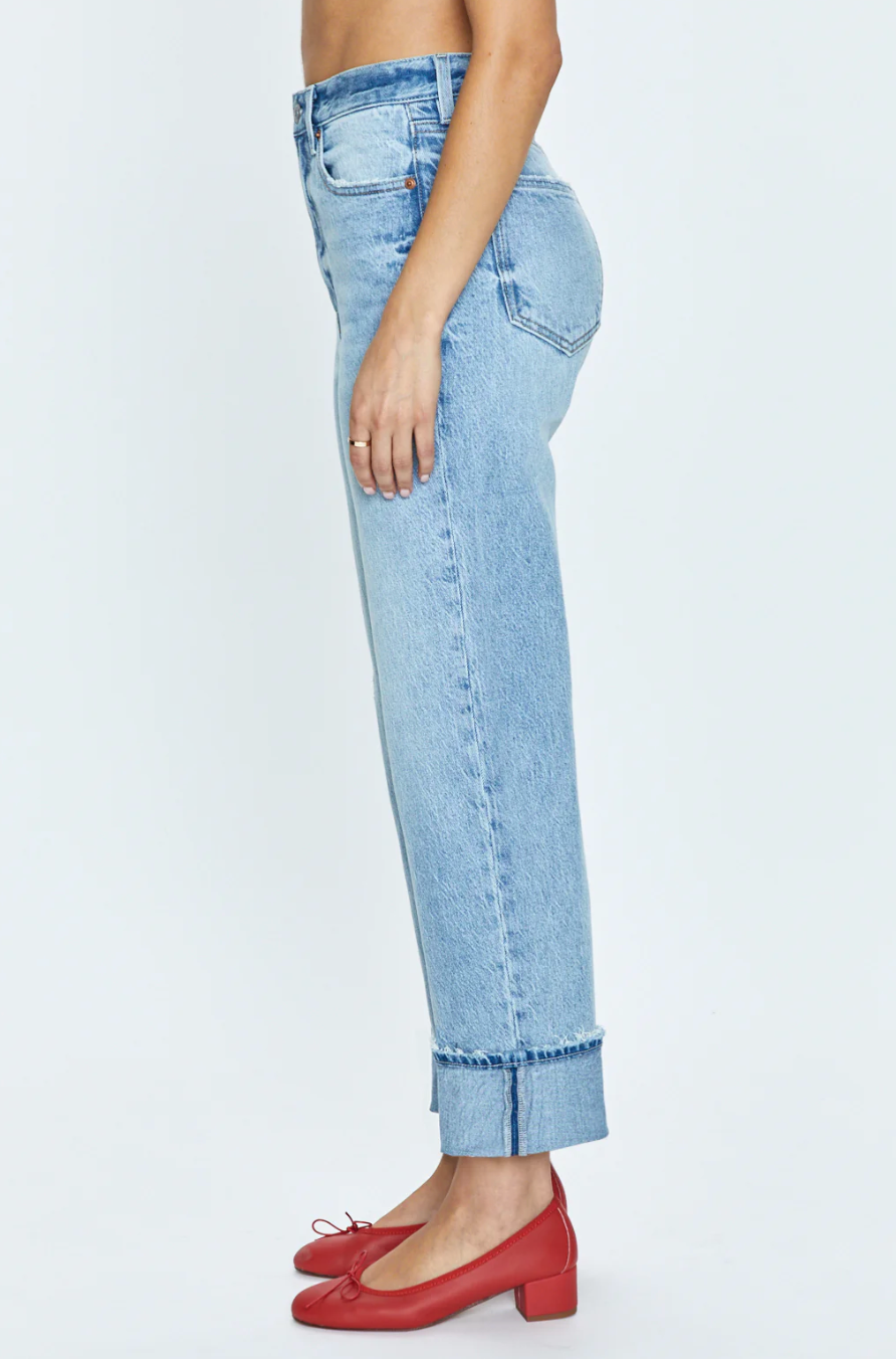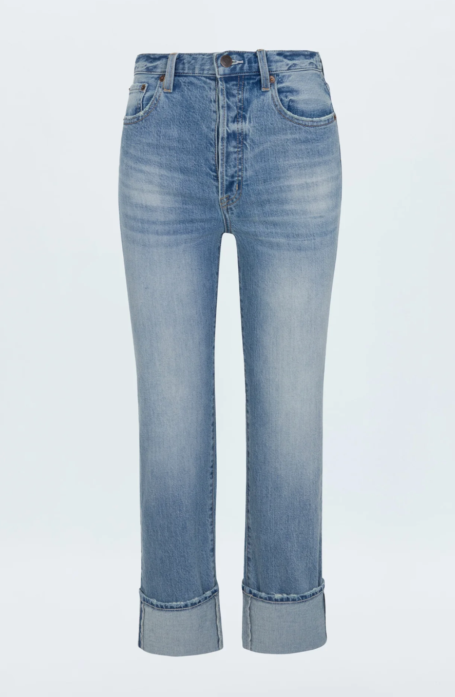 Super high rise waist with a composed straight leg silhouette and cuffed ankle hem crop. Crafted from our signature comfort stretch denim that provides a clean shape with just the right give. Panorama Vintage is a light blue wash with fading, whiskering, and barely-there hints of distressing.