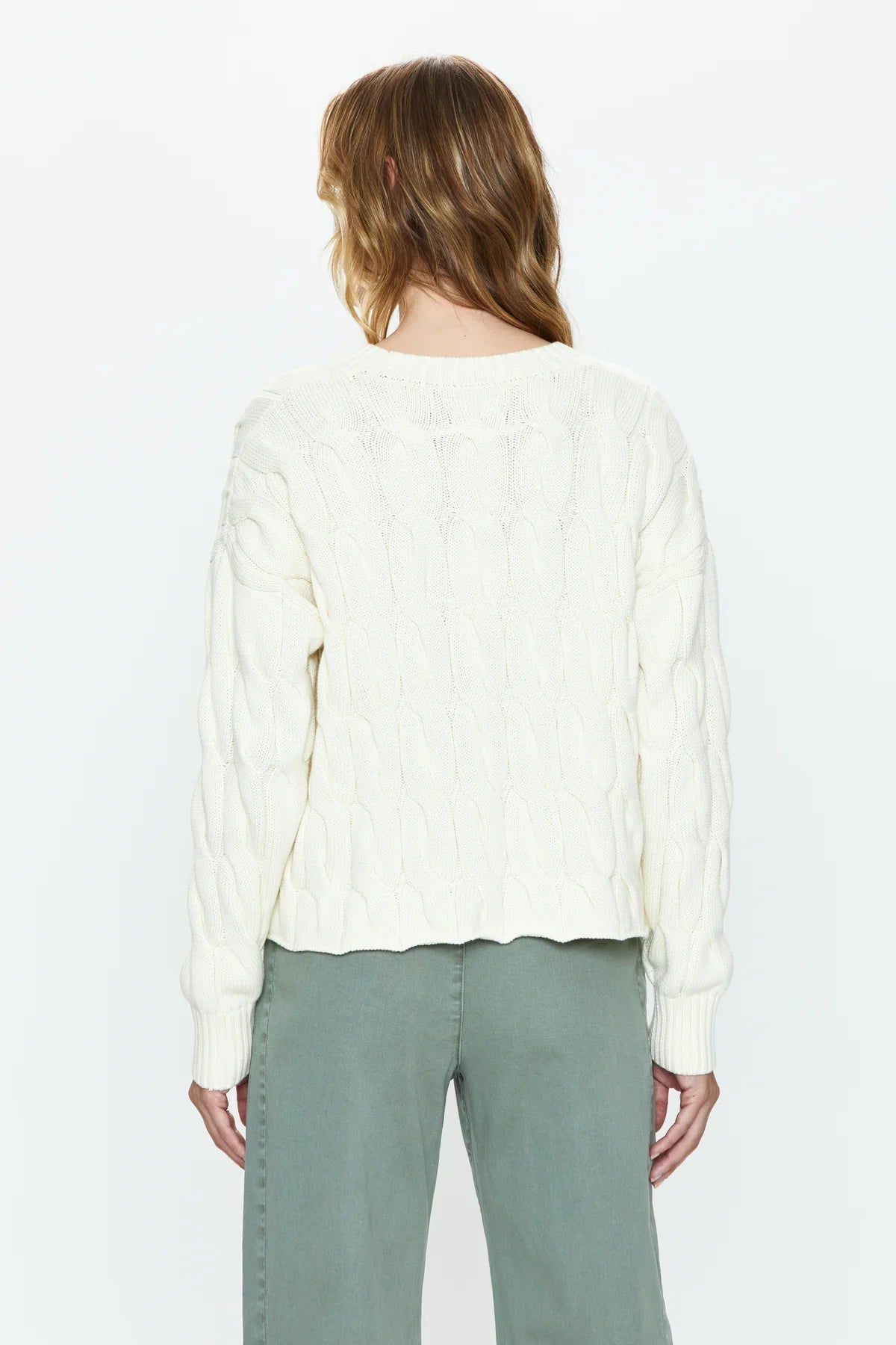 Midweight pullover sweater crafted with transitional wearability in mind, and defined by an eye catching geometric knit motif. Designed for a cropped fit, with ribbed cuffs and collar.