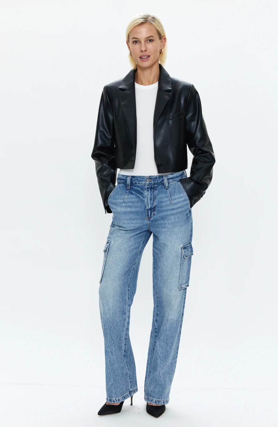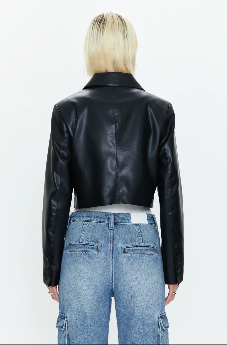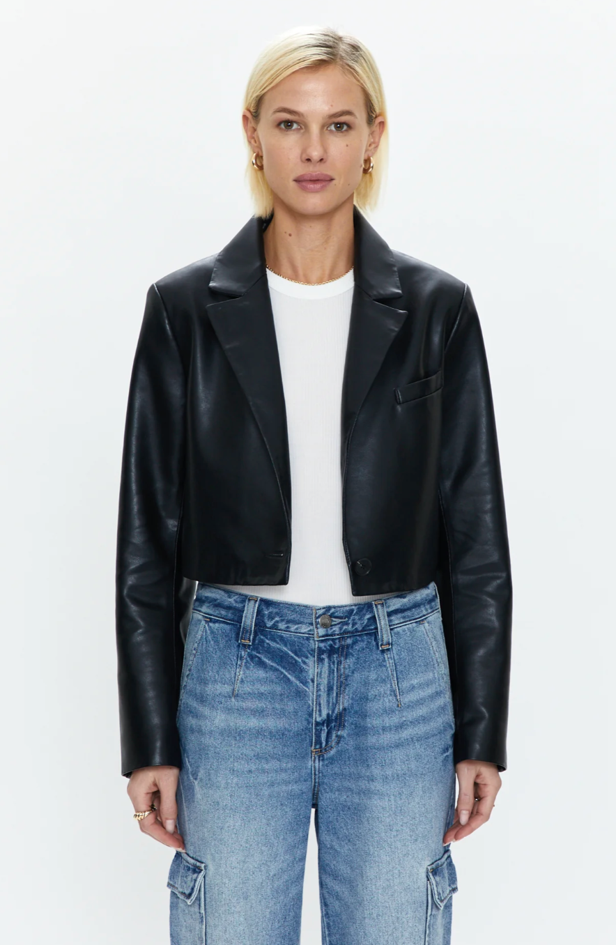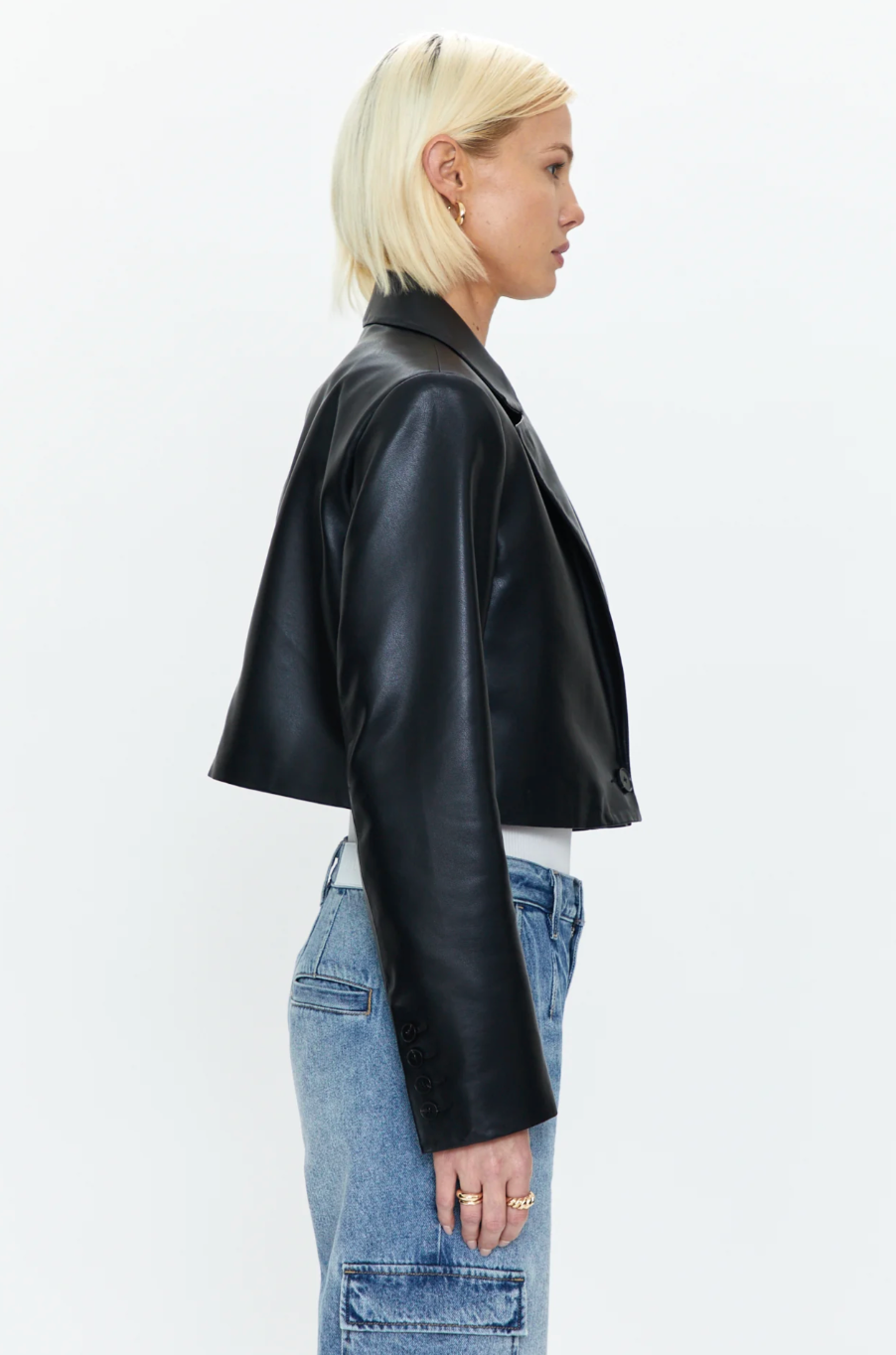 We've revamped leather blazers with this cropped silhouette version. This waist skimming outerwear is created in out buttery soft alt leather and can easily be paired back to our alt leather Alice Skirt or a classic blue jean.