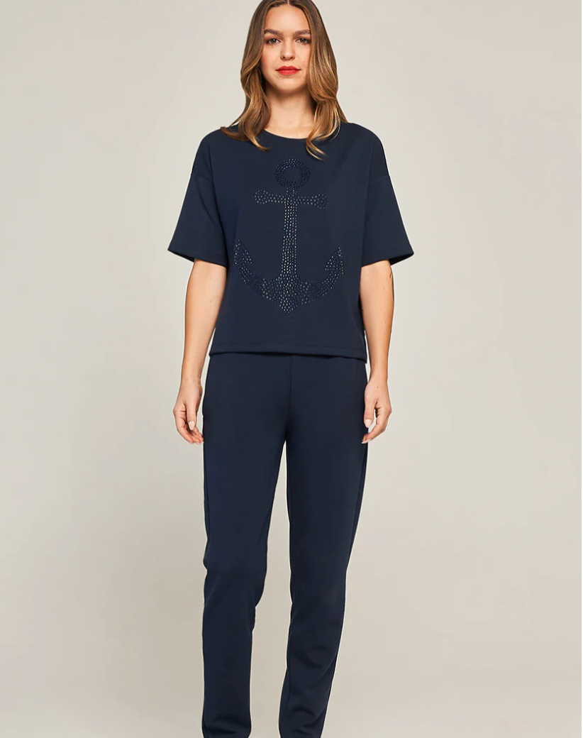 Sweat T-shirt with large anchor print and rhinestone decoration. Round neck and short sleeves.