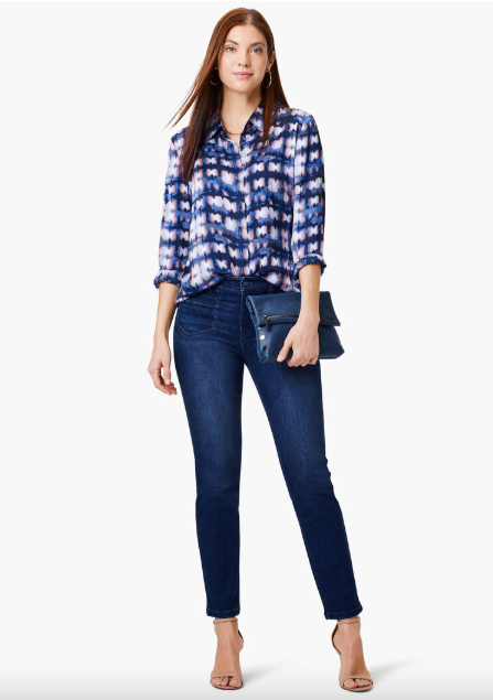An easy fitting long sleeve shirt with a classic button front in a dynamic print inspired by Shibori, the art of Japanese tie dye. Wear it with your favorite jeans or pair it with the matching slip skirt to create an effortlessly eye-catching set. Mindfully Made from partially recycled materials.
