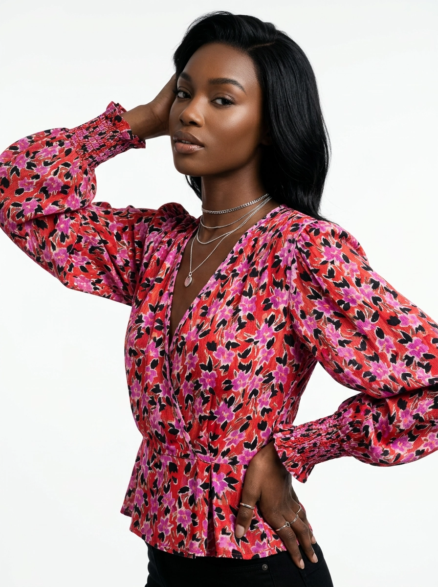 -Red floral print fluid blouse