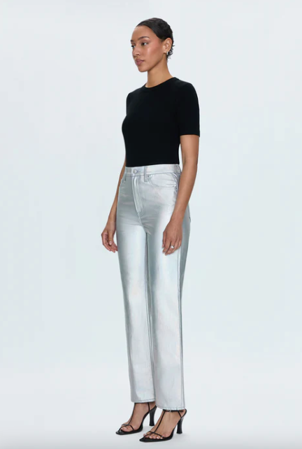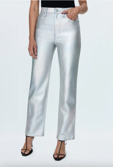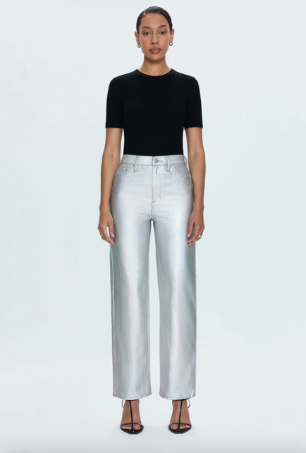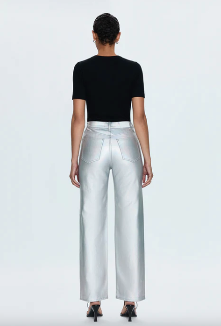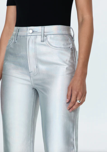 Super high rise waist with a classic straight leg silhouette and full length hem. Crafted from a non-stretch coated denim for a figure hugging fit. Coated Prism is an iridescent, high shine silver.