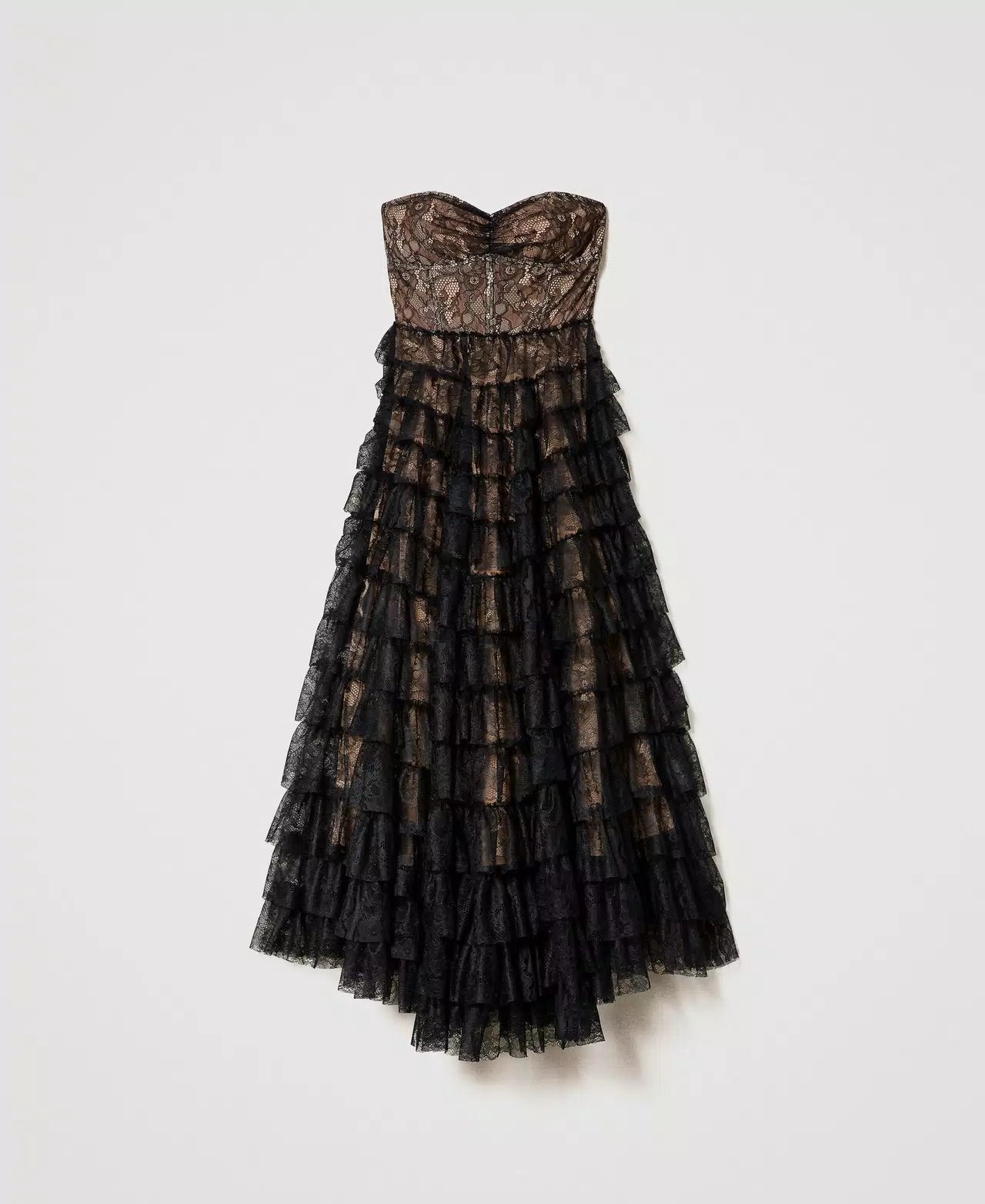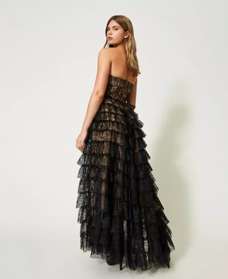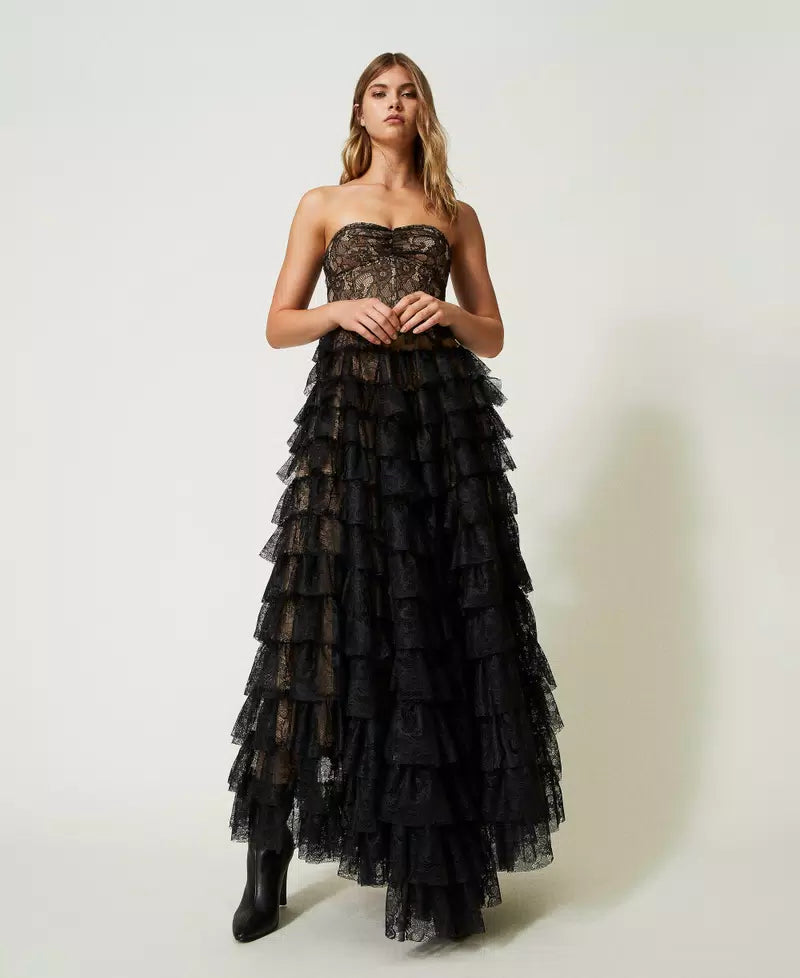 A stunning gown by world renowned Italian brand Twinset; featuring a bustier sweetheart bodice and a tiered lace skirt in black chantilly lace with a beige lining underneath. A dress made for a princess, this gorgeous floor length gown is sure to turn heads wherever you go.