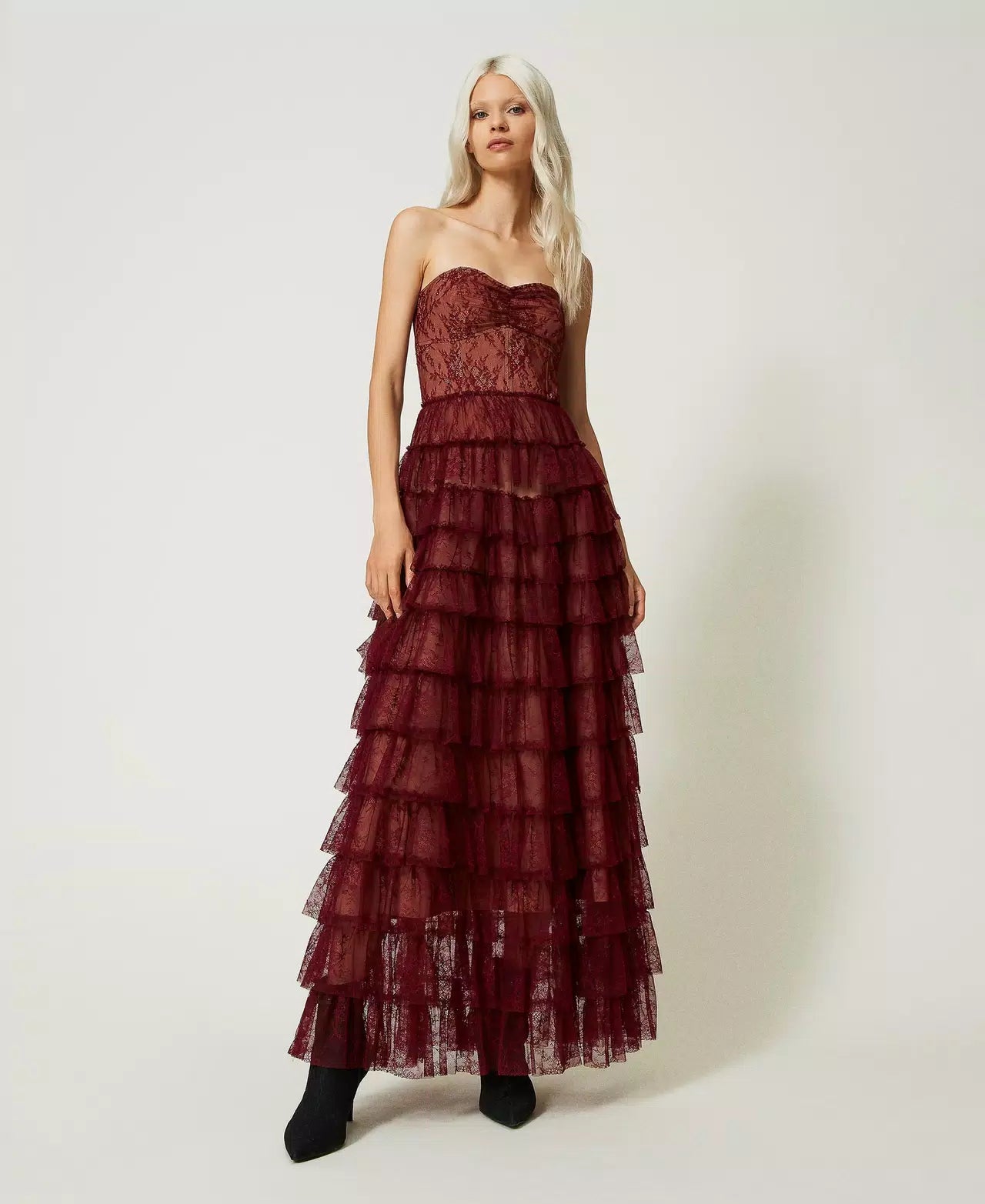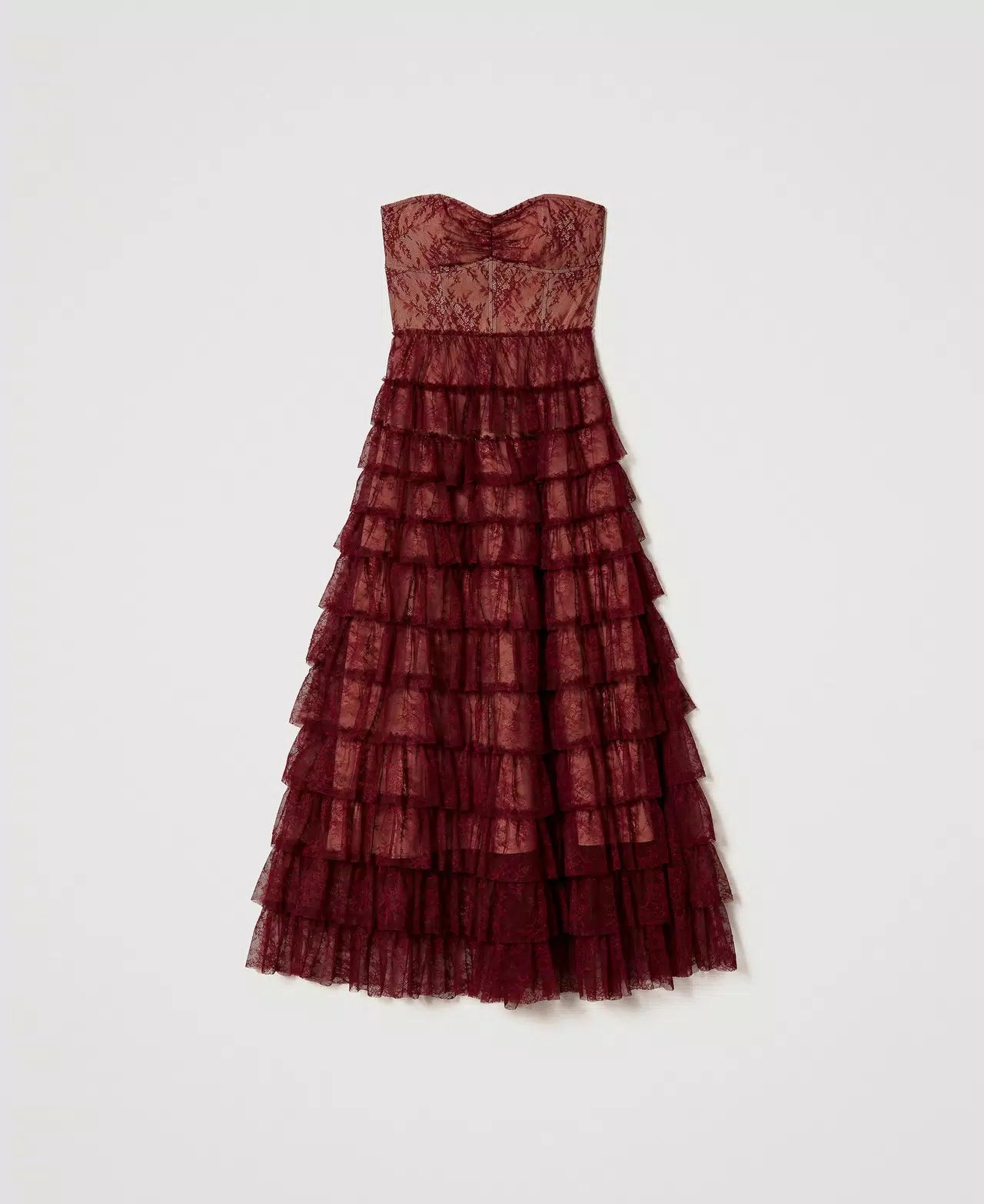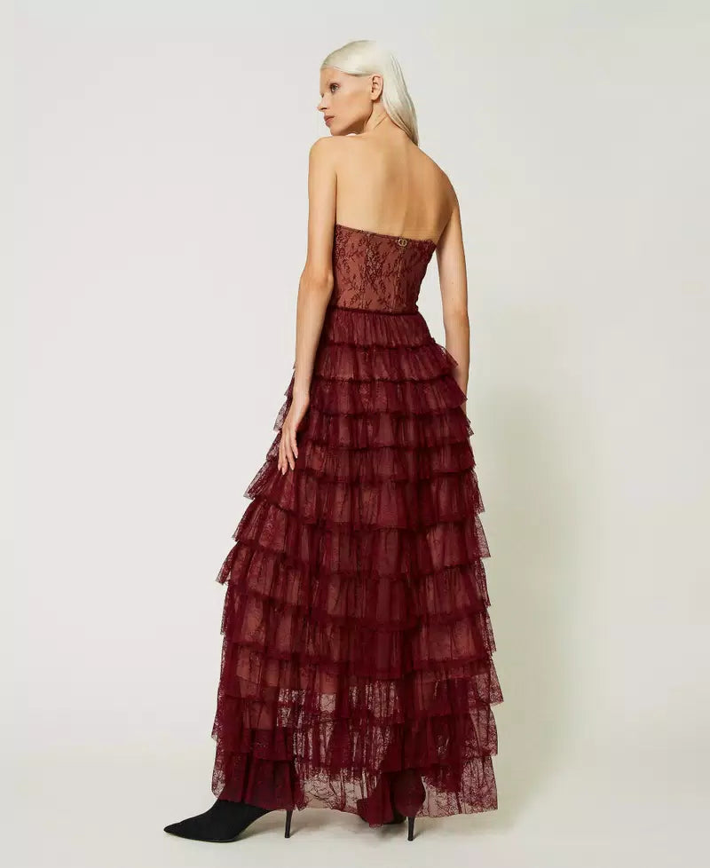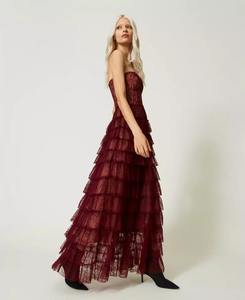 A stunning gown by world renowned Italian brand Twinset; featuring a bustier sweetheart bodice and a tiered lace skirt in a cabernet red chantilly lace with a beige lining underneath. A dress made for a princess, this gorgeous floor length gown is sure to turn heads wherever you go.