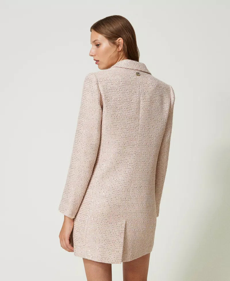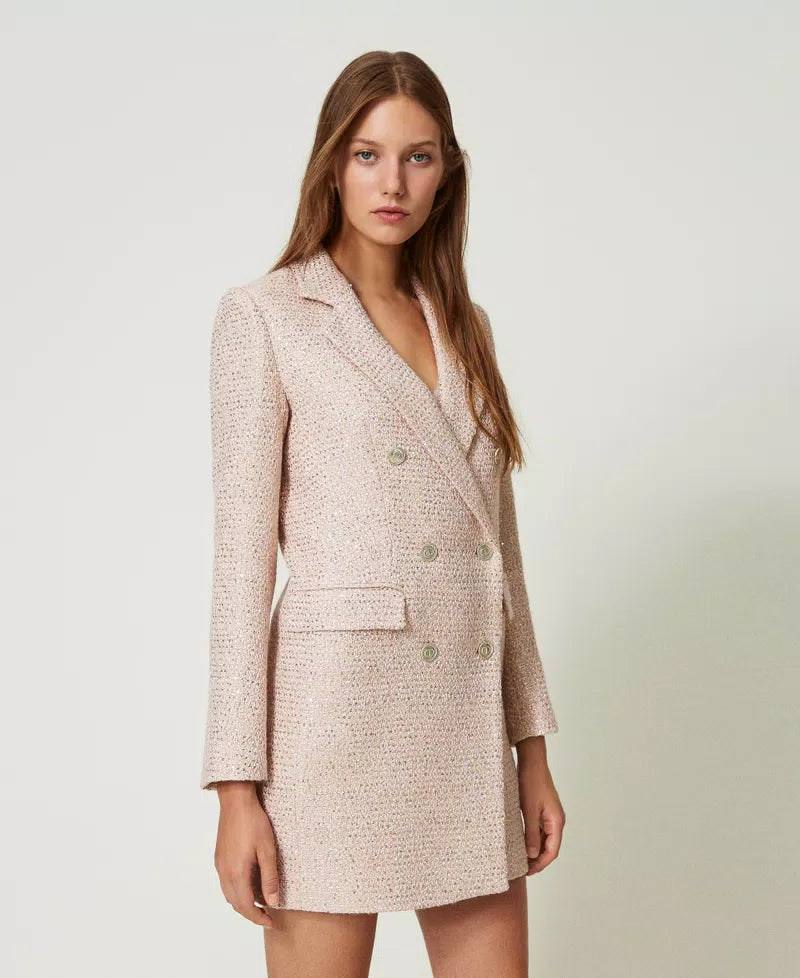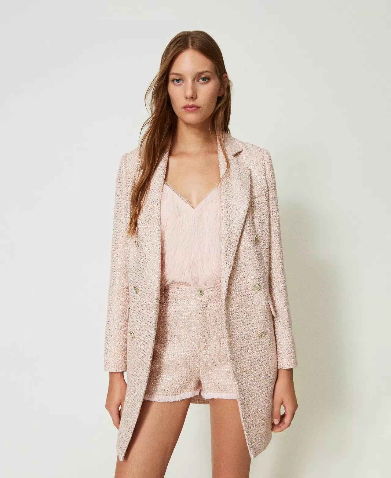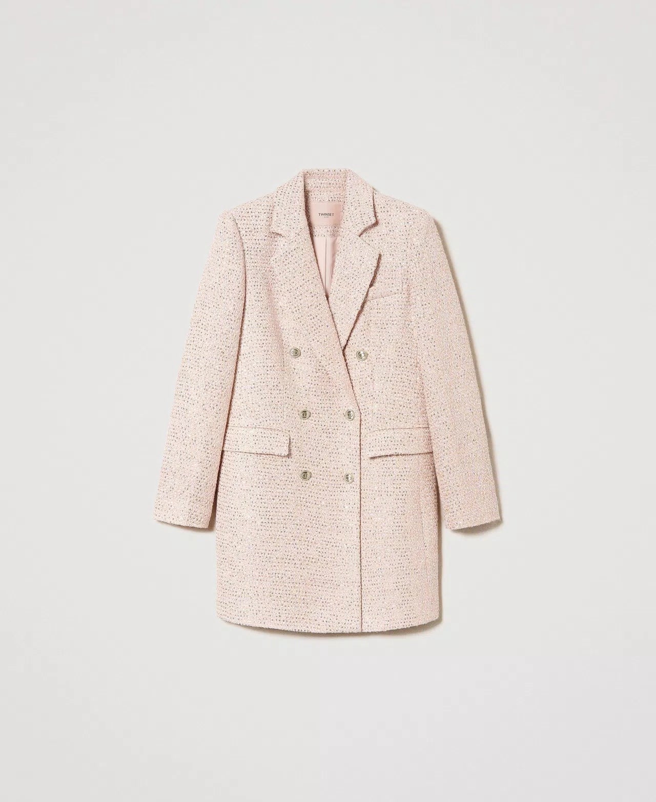 Glamour and tailoring at their best in this short coat by world renowned Italian brand Twinset; made from baby pink bouclé wool and cotton blend fabric with weaved lurex threads. Fitted, with lapels, double-breasted closure with metal buttons with Oval T logo, long sleeves with shoulder pad, flap pockets and breast pocket, rear slit and inner lining.