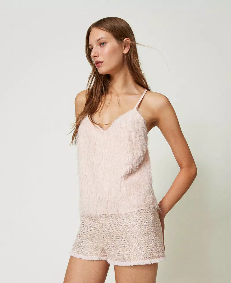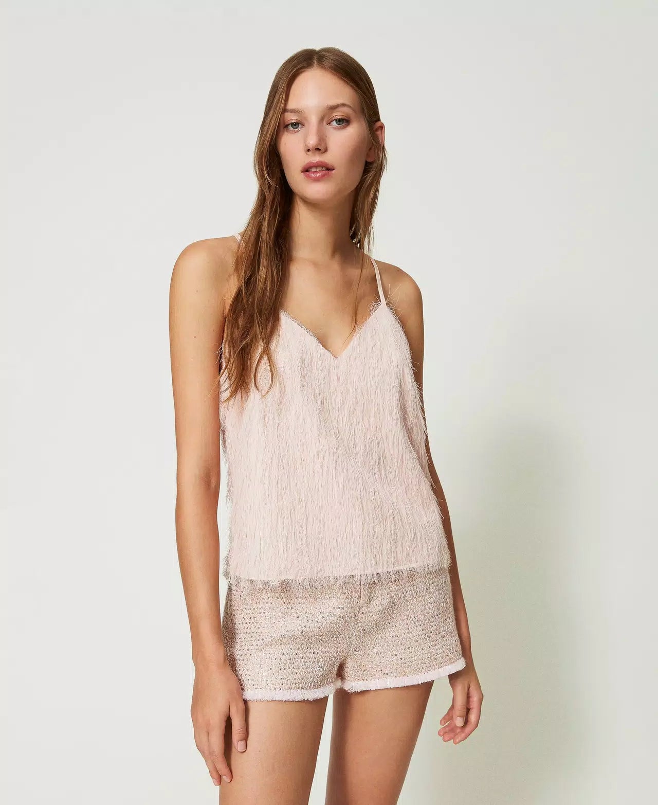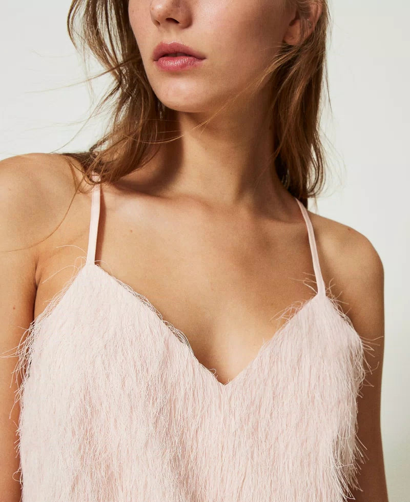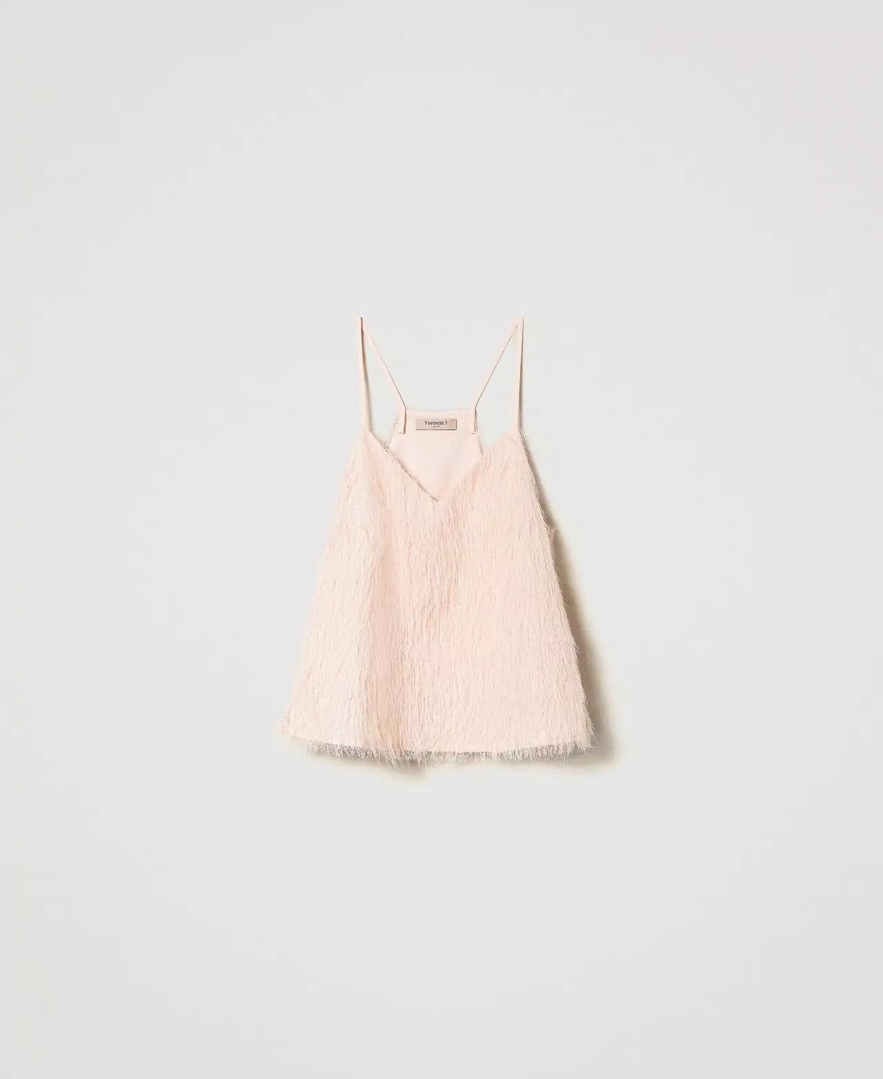 More than just a stylish top, this light fabric style with feather-like threads will be the star of your daytime and evening looks. Straight fitting with thin strap halter neck on the back, Oval T logo plate and inner lining.