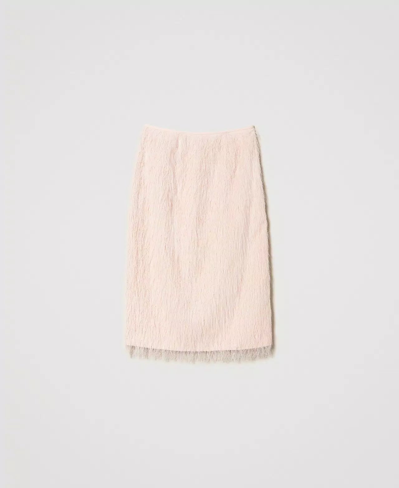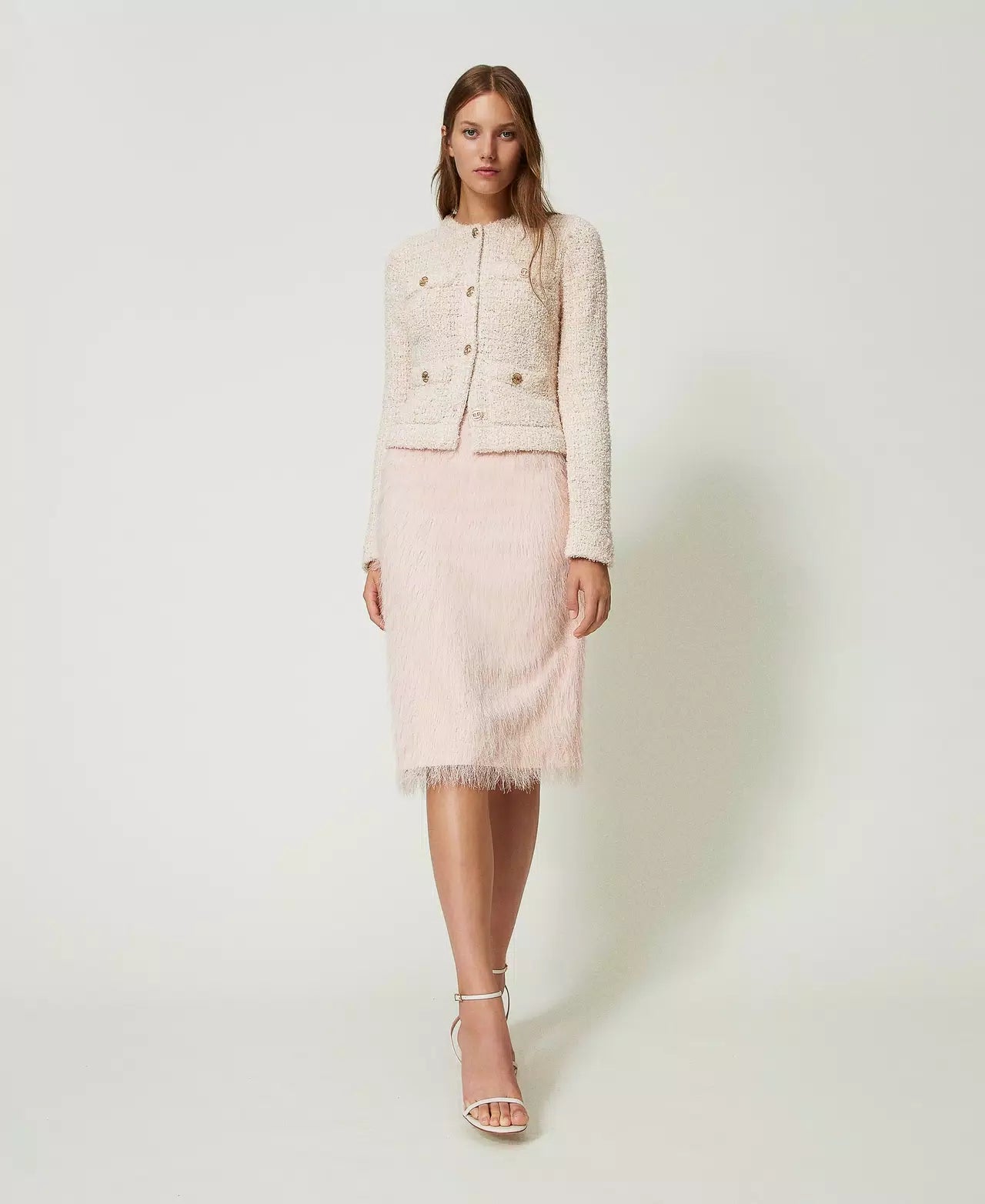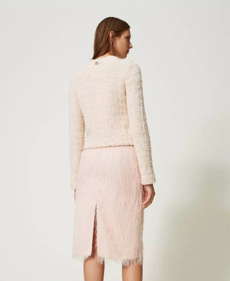 A bold skirt that will make you shine on special occasions by world renowned Italian brand Twinset. Made from light fabric, this straight fitting skirt features floating feather-like threads and side zip closure, central slit on the rear, Oval T logo plate on the back and inner lining.